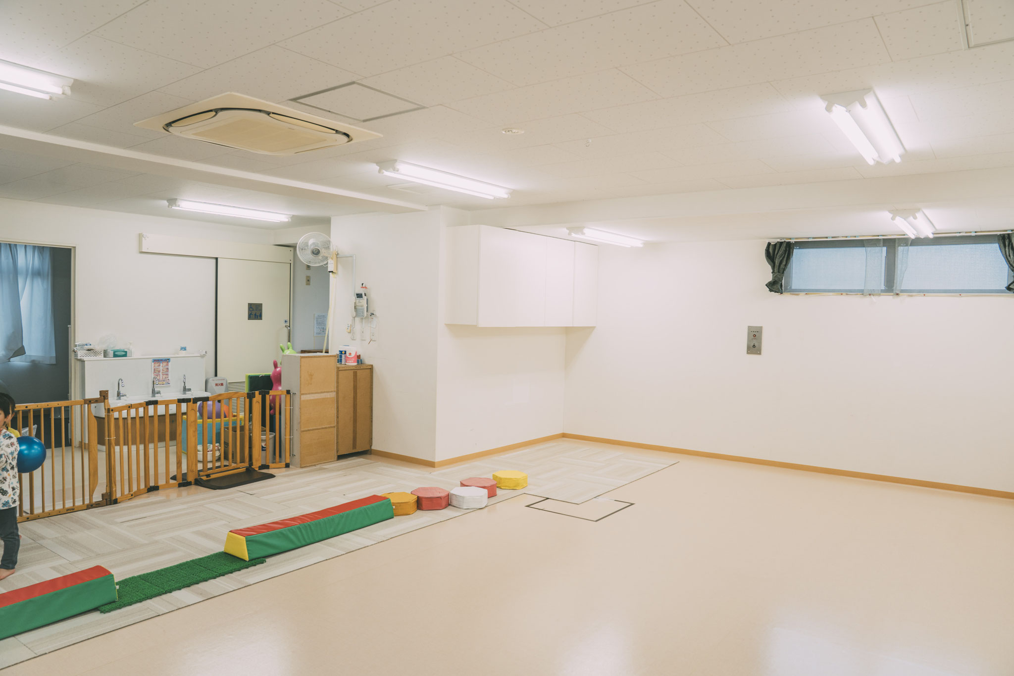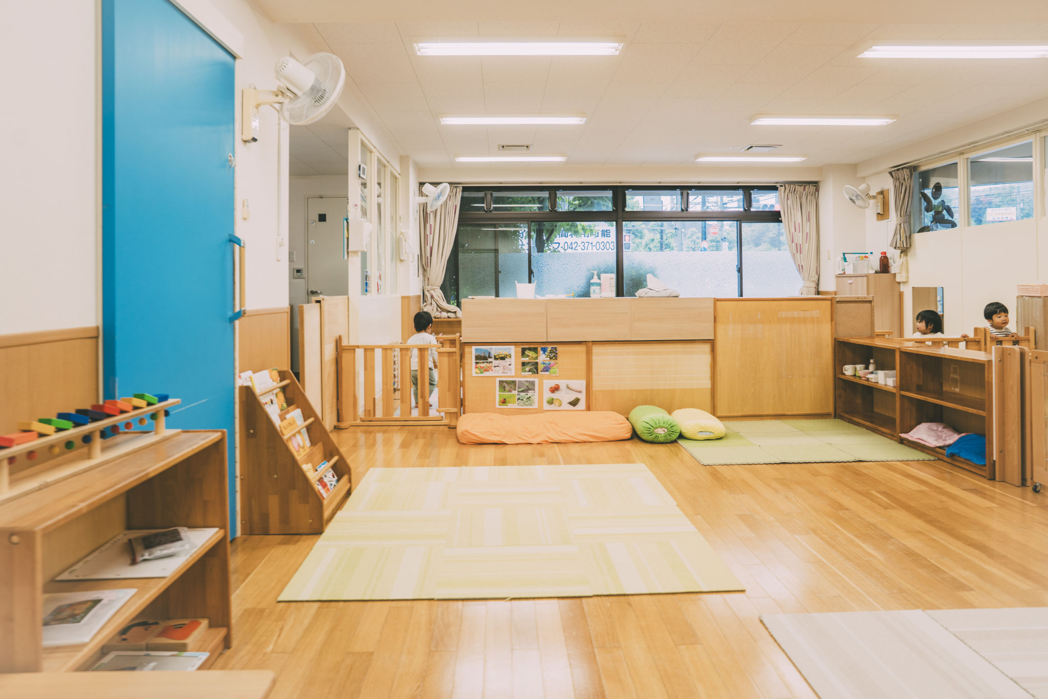 園庭はありませんが、天気の良い日はほぼ毎日歩いて近隣の公園へお散歩。大型ベビーカーは使わず自分の脚で一歩一歩歩き、子どもたちの脚力を育てます。雨の日でものびのび遊べる室内ホールや暑い夏に水遊びを楽しむウッドデッキも魅力です。保育室にはままごと道具や積み木など楽しいおもちゃや、乳児向け絵本や室内遊具が充実しています。
